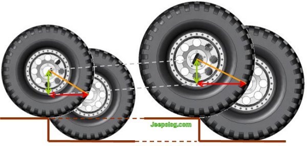 ההחלטה הגדולה כבר מאחורינו- תצורת הרכב. החלטנו שהרכב שנתכנן (ואולי נבנה) יהיה באגי דו מושבי, הנעה אחורית, מנוע אחורי (או אחורי- מרכזי), בעל מתלים נפרדים. אנחנו נמצאים רגע לפני ההחלטה שתקבע את כל הפרמטרים האחרים של הרכב. בבניה של רכב בכלל, ורכב שטח בפרט, ורכב מרוץ בפרט-בפרט, יש נתון אחד גדול שצריך לקבוע ראשון, וממנו נגזר כל התכנון - הגלגל. התכנון מתחיל בפועל בזריקה של 4 גלגלים על הנייר/מחשב/רצפת הסדנא. אלו צריכים להיות הגלגלים בגודל האמיתי, הסופי של הרכב. אז מה גודל הגלגלים הרצוי של רכב מרוצים לשטח? במשפט אחד קצר - כמה שיותר גדול, יותר טוב. גלגלים גדולים יאפשרו נסיעה מהירה יותר, ובשביל זה יש מכוניות מרוץ, לא? בכתבה זאת נסביר את העובדה הזאת. לשימוש בגלגלים גדולים יש מחיר, הם דורשים הרבה ממערכות הרכב, הם מגדילים את העומסים, וכתוצאה מזה כל הרכיבים צריכים להיות חזקים יותר, ולכן כבדים יותר, מה ששוב מגדיל את העומסים וחוזר חלילה. גם על החסרונות של גלגלים גדולים נסביר בהמשך. בכל מקרה, אנחנו מתכננים את הרכב סביב גלגלים בקוטר 35 אינץ' ורוחב 12.5 אינץ'. 35 אינץ' זהו הקוטר המקסימאלי שמותר לפי תקנון FIA למרוצי cross-country rally בקטגוריית T1 2X4. למה צמיג גדול מהיר יותר בשטח? קודם כל שימו לב שאנחנו לא שואלים "האם צמיג גדול מהיר יותר בשטח", אלא למה. העובדה שצמיג גדול מהיר יותר, היא עובדה ידועה. בכתבה הזאת ננסה להסביר את התיאוריה - למה - שמאחורי עובדות, אבל גם בלי לקרוא, להבין או להסכים עם מילה ממה שנכתוב כאן, זו עובדה - הן במרוצי ראלי רייד, הן במרוצי מדבר, וכמובן שגם בתחרויות עבירות, כל המתחרים משתמשים בצמיג הגדול ביותר שהתקנות מתירות להם. עצם זה שהתקנות קובעות מידת מקסימום, מצביע טוב יותר מאלף עדים על נכונות העובדה. תקנות טכניות של מרוצים הן תוצר אבולוציוני של עשרות דורות של רבייה והתקדמות של טכנולוגיה. אם יש בהן מגבלה, זה אומר שמי שעובר על המגבלה, זוכה ביתרון לא הוגן על המתחרים האחרים. עכשיו נעבור לתיאוריה. מה קובע את מהירות הרכב? מה הבקר (controller) שקובע את המהירות הספציפית בקטע דרך מסוים? הנהג. הרכב מעביר את חוסר האחידות של הדרך, דרך 'פונקצית תמסורת' של הגלגלים, מתלים, שלדה, לנהג. כשלנהג יהיה לא נוח- הוא יוריד את הרגל מהגז. לא נוח משמעותו תאוצות גדולות והלמים (הלם = המילה של המהנדסים למכה, בומבה, ובאנגלית Shock), בעיקר בציר האנכי. המטרה ברכב מרוץ לשטח בנסיעה בקו ישר, היא להקטין את התאוצות הפועלות על הנהג בציר האנכי. אגב, אתם יכולים להגיד שנהג יכול לחשל את עצמו ולנהוג מהר גם כשלא נוח לו - זה אולי נכון, אבל התאוצות שהנהג מרגיש הן התאוצות, ההלמים והמכות שמתפזרות בכל הרכב, מפרקות חלקים, מפוצצות בולמים, מעקמות סרנים, תולשות תושבות מנוע... הנהג לומד מניסיון את הקשר בין התחושות שלו להתפרקות של האוטו, ואיך שלא מסתכלים על זה, מה שהוא מרגיש גורם לו להאט ולהאיץ. בשונה מנסיעה בכביש, בה ההתנגדות העיקרית לנסיעת הרכב היא התנגדות האוויר וההתנגדות לגלגול, בנסיעת שטח מהירה ההתנגדות העיקרית להתקדמות הרכב היא פני השטח. כל הפרעה בפני השטח גורמת לגלגל לעלות ולרדת. כל תנועה כזו של הגלגל, המתלים, והרכב כולו- דורשת אנרגיה. ככל שההפרעה גדולה יותר- נדרשת אנרגיה רבה יותר. מערכת מתלים טובה, בצירוף גלגלים מתאימים- יקטינו את בזבוז האנרגיה. ככלל, ניתן לומר שהצמיג מטפל בהפרעות בדרך שהן בגודל (אורך, גובה) קטן מהרדיוס החיצוני של הצמיג. אפשר לחלק את ההפרעות בשביל לצורות בסיסיות של "בור", "מדרגה" ו"בליטה". בנוסף, נבחן את התנהגות הצמיג כקפיץ שהוא חלק ממערכת המתלה, ובנסיעה על חול יבש. אנחנו מדברים על מדרגה קטנה מרדיוס הצמיג. כשהרכב מגיע למדרגה, יש נקודה בגלגל שנוגעת במדרגה, וסביבה כל הגלגל מטפס. קיים מרחק אופקי מסוים אותו הרכב יתקדם, עד שהגלגל כולו יהיה למעלה, ובזה הסתיימה תנועת הגלגל כלפי מעלה. המרחק האופקי הזה, מסומן בחצים אדומים באיור למטה, והגובה של המדרגה, החץ הירוק, מגדירים