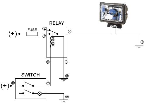 השיטה הנכונה היא חיבור דרך ממסר, על פי הסכימה הבאה. בשיטה זו הפנסים יפעלו רק כשהסוויץ' פתוח, כך שהסכנה לריקון מצבר פוחתת. כמו כן, כבלי הזרם הגבוה בעל אורך מינימאלי, ולתוך תא הנוסעים אנחנו מכניסים רק חוט פיקוד דק. קצת על ממסר : כאשר בין רגל 5 (מספר 85 על הממסר) לבין רגל 6 (מספר 86 על הממסר) יורגש מתח הסליל 'יטען' וימשוך את המתג ממצב "כבוי" למצב "דלוק". כאשר יפסק המתח הסליל 'יתפרק' וירפה מהמתג ויפסיק את העברת הזרם דרך הממסר. ולהסבר הפשוט : כאשר אין מתח על נק' 5,6 הממסר יאפשר מעבר זרם בין נקודות 2 ו4 . בעת מתח על נקודות 5,6 הממסר יאפשר מעבר זרם בין נקודות 3 ל4 בחיבור זה אנו נשתמש. * אין חשיבות לקוטביות על 5,6 וכנ"ל לקוטביות על 3,4