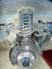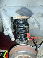 מתחו חזרה את הבולם וכווצו בעזרת הג'ק את הקפיץ בנקודת חיבור הבולם עד למגע עם הבולם, חברו את הבולם. חברו את פחית כבל בלם היד חזרה למקומה, שמרו על הכבל משוחרר. חברו את הגלגל וסגרו את הברגים. הורידו את הרכב וחזרו על הפעולה גם בצד השני. פירוק והתקנת קפיצים קדמיים : שוב - כדאי ומומלץ לעבוד על משטח ישר, הניחו אבן או מעצור מתחת לגלגלים האחוריים. שחררו את בורגי הגלגל המיועד לפירוק. הרימו את הרכב בחלק הקדמי עם הג'ק. הניחו את בלוק העץ מתחת לשלדה בנקודה הכי קרובה לג'ק ושחררו את הג'ק – שוב - יש לו משימות אחרות. פרקו את הגלגל והניחו אותו בצד.