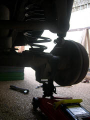 פירוק והתקנת קפיצים אחוריים : כדאי לעבוד על משטח ישר, הניחו אבן או מעצור מתחת לגלגלים הקדמיים. שחררו את בירגי הגלגל המיועד לפירוק. הרימו את הרכב בחלק האחורי עם הג'ק. הניחו את בלוק העץ מתחת לשלדה בנקודה הכי קרובה לג'ק ושחררו את הג'ק – יש לו משימות אחרות. פרקו את הגלגל והניחו אותו בצד.