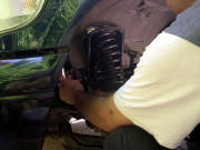שוב - נקו ושמנו את התושבות, הניחו על התושבת בחוץ את הקפיץ החדש, את הקפיץ הניחו עם הכיתוב באופן שניתן לקרוא אותו. הניחו את המכלול במקומו הכי נמוך שאפשר והכניסו את הקפיץ למקומו, שמנו היטב את תושבת הגומי העליונה בכדי שהקפיץ יחליק בקלות למקומו, ברגע שהקפיץ "התיישב" במקומו תתחילו להרים את הג'ק ולכווץ את הקפיץ, תשתמשו בפלייר שפיץ בכדי להרים את זרוע הבולם למעלה ככל האפשר ובשילוב של מכוון מלמעלה כוונו את זרוע הבולם פנימה. הניחו את הגומייה הפחית והדסקית על ראש הבולם וסגרו את בורג ראש הבולם, הקפידו שהגומיות והדסקית "ישבו" היטב במקומם.