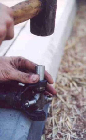 כוסית ראשונה נכנסת מלמעלה בדפיקות פטיש עדינות כמו בתמונה. בשביל לא לפרק את האימא של הסיכות, מכניסים את הכוסית כאשר הצלב בתוכה ומונע מהסיכות ליפול. צריך לתמוך עם האצבעות את הצלב שלא ייפול. דופקים את הכוסית פנימה הרבה מעבר לחריץ, כך שהצלב יבלוט כמה שיותר לצד שני.
