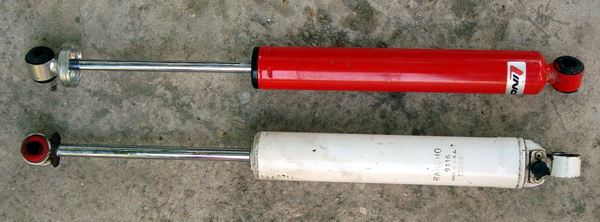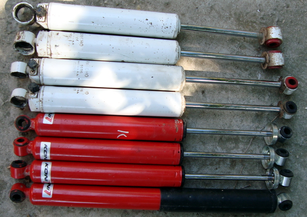 עוד נקודות ראויות לציון - הקוני צרים יותר (50 מ"מ קוטר חיצוני לעומת 56 לראנצ'ו). לא לשכוח שהבוכנה שלהם עדיין גדולה יותר משמעותית בגלל המבנה השונה! הם קלים הרבה יותר - לא שקלתי, אבל לדעתי הם שוקלים 20-30% פחות. עניין המשקל שולי בג'יפ טיולים, אבל בכל זאת. קוטר המוט הדחיף קטן יותר בקוני - 14 לעומת 16 מ"מ. רוחב האוזניים בקוני קטן יותר מאשר בראנצ'ו - 35 לעומת 41 מ"מ. וזו נקודה חשובה לדעתי במקרה הספציפי שלי, הרבה חרא אכלתי מהגומיות של הראנצ'ו. הקוני, הקטנים מעט יותר, פשוט מתאימים יותר לצ'רוקי כך נראה.
