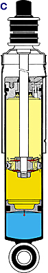 הבעייה היסודית של הבולם ההידראולי היא זאת: כשהבוכנה שוחה קדימה ואחורה בתוך הנוזל, נכנסת ויוצאת, הנפח שלו משתנה. הסיבה היא המוט של הבוכנה - ככל שהבולם נלחץ ונסגר, יותר ויותר מהמוט נכנס פנימה ומצמצם את הנפח הפנוי לנוזל. אבל נוזלים לא יכולים לשנות את נפחם. הם בלתי דחיסים בשפה מדעית, וזו התכונה הבסיסית שמבדילה בין מצב צבירה "נוזל" לגז, בין מים לאוויר. נפח הצינור אם כן אינו יכול להיות מלא לגמרי בנוזל - חייב להיות בו גם אויר, או גז אחר, משהו שידחס כשהבוכנה נכנסת ויתפשט כשהבוכנה יוצאת. בבולם הפשוט ביותר האפשרי, כזה שלא תתקלו בו במציאות, אכן יש תערובת של נוזל וגז - אמולסיה. אבל האמולסיה לא אחידה בתכונותיה, רגישה ביותר לחום - בקיצור, לא באה בחשבון. יש צורך להפריד בין הנוזל שעובד לבין הגז, ועד היום נמצאו שני פתרונות כלליים - בולם המונוטיוב, שאני מכנה "טורי", ובולם טווין-טיוב, "מקבילי". בולם המונוטיוב הוא הפשוט יותר להסבר. כל מה שנוסף בו הוא בוכנה קטנה נוספת, צפה, שמפרידה בין חלל הנוזל שבו עובדת הבוכנה ובין נפח גז קטן, לרוב דחוס ללחץ אטמוספרות אחדות. בשרטוט משמאל (מסומן C ולקוח מהאתר של קוני) הנוזל בצהוב, הגז (חנקן דחוס לכ20-30 אטמוספרות) בכחול. הבוכנה נראית כשהיא נעה כלפי מטה. הנוזל שמתחתיה נדחס, חלקו עובר דרך המעברים בבוכנה למעל, ונפח הנוזל הכללי גדל, על חשבון נפח הגז שקטן.