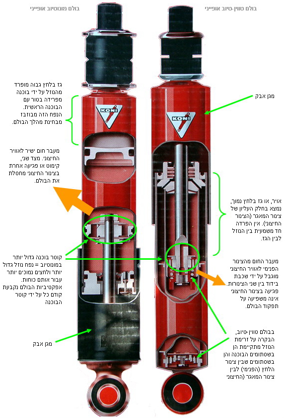 יתרונות וחסרונות - טווין- מול מונו-? בולם מונוטיוב הוא התצורה האלגנטית יותר. יש בה פחות רכיבים, פחות משקל, פחות פלדה. אז למה הוא הנדיר יותר, ורובנו ברוב הרכבים לא משתמשים בו? שלוש סיבות. הראשונה, פונקציונאלית - עבור מהלך בוכנה נתון, הוא ארוך יותר. זה די ברור מהתמונות, וההגדרה שלו כ"טורי" - יש בו נפח מסוים, נפח הגז, שאינו תורם למהלך. בעוד שבבולם המקבילי, הבוכנה מנצלת את מלוא אורך הבולם. בולם הטווין טיוב הוא לכן קומפקטי יותר במימד האורך, וזה קריטי כשצריך לארוז בולם בתוך מכונית מודרנית. הוא מאפשר לתכנן למשל, קו מכסה מנוע נמוך יותר, ולחסוך מקום בכנפיים האחוריות. לכאורה גם באפליקציות של ג'יפים מוגבהים עניין זה אמור לעניין אותנו, כי אנחנו מעוניינים במקסימום מהלך מתלה. סיבה שנייה - הגנה מנזקים. בבולם מונוטיוב, עיקום של הצינור, איזו מכה רצינית שיכולה להיגרם לעיתים אפילו על ידי אבן גדולה, ימנע מהבוכנה לנוע בחלקות ו/או יפגע באטימה - בכל מקרה הבולם גמור. לעומת זאת בטווין טיוב, הצינור החיצוני יכול להתקמט, להתעוות ולחטוף הכל - כל עוד הוא לא ממש מחורר, אין השפעה על הביצועים. סיבה שלישית היא מחיר - עלויות הייצור. הייתם מצפים שהבולם שבשרטוט נראה מורכב יותר, ויש בו יותר חלקים, יהיה היקר יותר? זה לא המצב. דווקא בולמי טווין טיוב זולים יותר לייצור המוני. איכות ודיוק שטח הצינור הפנימי, עליו רצה הבוכנה, חשובים יותר - ויקרים יותר להשגה - דווקא בתצורת מונוטיוב. גם איכות האטמים הנדרשים גבוהה יותר. ומן הסתם יש יותר סיבות, אני יכול לחשוב על לא מעט אבל זה לא ממש משנה - זו עובדה. מה היתרון של המונוטיוב עם כן? ביצועים. הביצועים של הבולם הם קודם כל פונקציה של שטח הבוכנה, ובמונוטיוב, הבוכנה בהגדרה גדולה יותר. ושנית, פינוי חום. בבולם מונוטיוב מעבר החום ישיר מהמקום בו הוא מיוצר - במעברים של הבוכנה - דרך שכבת מתכת אחת - לאוויר העולם. בבולם טווין טיוב לעומת זאת, הנפח שבין שני הצינורות, שבחלקו הגדול הוא בכלל חלל אויר או גז, יוצר ממש שכבת בידוד, שמקשה מאד על פינוי החום. משתי הסיבות האלו, כל בולמי המרוצים בעולם, בכל תחום של ספורט מוטורי, הם בולמי מונוטיוב, כמעט בהגדרה. לסיכום הפרק התיאורטי של הכתבה, הנה תמונה של שני בולמים אופייניים של קוני (מונוטיוב אופייני משמאל, טווין-טיוב מימין) עם הערות: