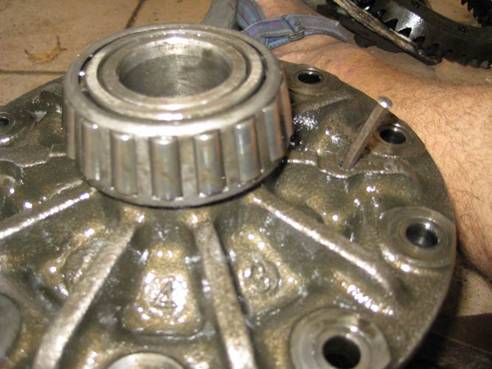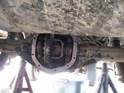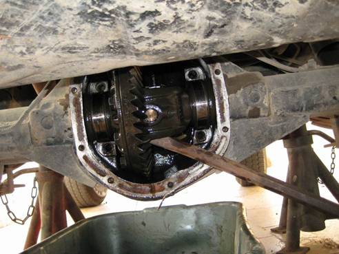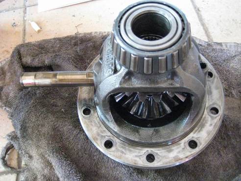 8. כך, כמובן, בשני הגלגלים, עד שניתן יהיה להוציא את הקייס של הדיפרנציאל. פירוק הדיפרנציאל מתוך הסרן 9. פתח את ארבעת בורגי קסבות המסבים של הדיפרנציאל, והוצא אותם תוך סימון ימין/שמאל, ומעלה/מטה. חשוב שבסופו של תהליך כל קסבה תחזור למקומה בדיוק. הוצא את הקייס של הדיפרנציאל, כנראה שיהיה צורך בשימוש בלום ברזל גדול כמנוף. במידה ונתקלים בקושי, שים לב שהוצאת את הציריות מספיק החוצה, והן אינן מפריעות ליציאת הקייס.