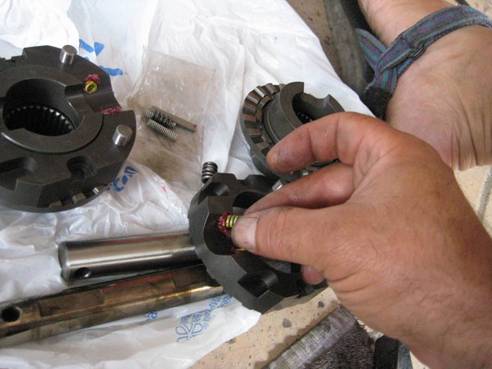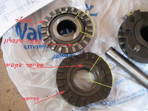 הדרייבר והספייסר האקטיבי אינם חלק אחד, ויש חשיבות למיקום השן של הספייסר האקטיבי בתוך הדרייבר. המיקום הנכון מוקף בקשת צהובה בתמונה. הקופלר וטבעת הסינכרון הינם חלק אחד, העשוי להסתובב אחד בתוך השני. המיקום הנכון של טבעת הסינכרון בתוך הקופלר מוקף בתמונה בקשת צהובה. קרא את 5 הסעיפים הבאים קרוא וחזור היטב, נסה להרכיב "על יבש", עד שתהיה משוכנע שהבנת לחלוטין את שמות החלקים, את המיקום של כל אחד ביחס לשני ואת אופן ההרכבה. 13. שים מעט גריז בשמונת החורים שבדרייברים (4 בכל דרייבר), והכנס אליהם את 8 הקפיצים הצהובים. מרח גריז גם על שיני הדרייבר, והכנס אליו את הספייסר האקטיבי, כך שהשן של הספייסר נמצאת במקום הנכון, המרווח הגדול בדרייבר, כפי שמסומן בצהוב בתמונת החלקים. אז, גם פתחי השקעים מתאחדים, כבתמונה למטה.