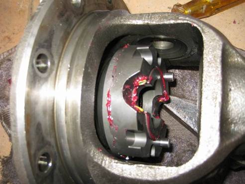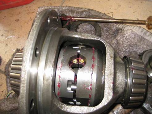 סובב את הדרייברים בתוך הקייס 90 מעלות, והכנס את הקרוס שאפט. כן, המחוזק שהגיע עם הנעילה. בסיום, הכנס שוב רול פין לנעילת הקרוס שאפט. הרכבת הסרן חזרה 19. החזר את הרינג אל הדיפרנציאל, תוך תשומת לב לסימון המיקום שסימנת קודם לכן. סגור את הברגים למומנט של 45-60 ליברות-פיט, לאחר מריחת נוזל הידוק ברגים (לוקטייט) 20. הכנס את הדיפרנציאל למקומו. החזר את קסבות המסבים למקומן לפי הסימונים שסימנת, וסגור אותם בצורה הדרגתית למומנט של 35-50 ליברות-פיט, תוך שימוש במעט לוקטייט.