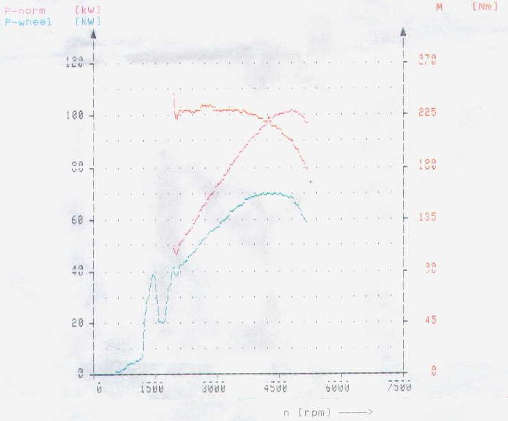 מקרא לגרפים: ציר הX הוא מהירות סיבוב המנוע, בסיבובים לדקה. ציר Y מראה משמאל הספק, בקילואט ( כוח סוס אחד שווה 0.75 קילוואט). מימין, המומנט, בניוטון-מטר. הקו הכחול מציג את ההספק בגלגל כפונקציה של סל"ד, הקו הורוד מציג את ההספק המנורמל (מתוקן ע"י המחשב, ראה הסבר למעלה) כפונקציה של סל"ד, הקו הכתום מציג את המומנט כפונקציה של סל"ד. כאשר משווים בין הגרפים יש לשים לב לסקאלות - לא כולן זהות! לצערנו לא התאפשר לנו לקבל את הנתונים הגולמיים שהיו מאפשרים לנו להלביש גרפים אחד על השני, ולכן על הקורא לרפרף מגרף לגרף...