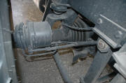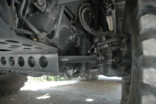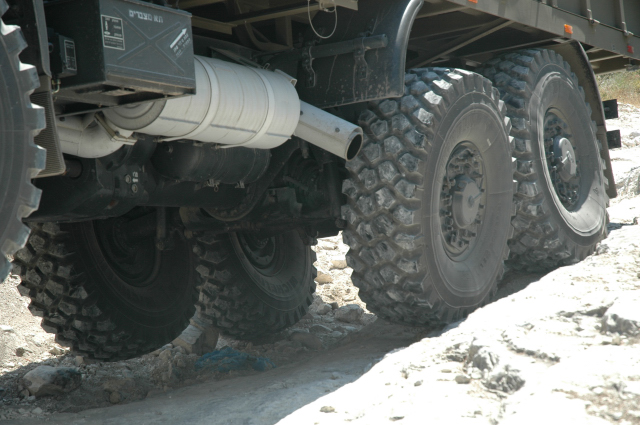 חצי-סרן באחד הגלגלים האחוריים, מה שנראה כמו במפסטופ הוא מנוף ההפעלה של כרית האויר שיושבת מעל צינור-השדרה של המשאית. החיסרון הגדול של שלדת הצינור - מרווח גחון נמוך, באמצע ולכל אורך הרכב. בתמונה זאת בולטת זווית הבטן הגרועה. הארגז מתחבר לשלדה על ידי יובולטים. לוח הפיקוד למערכת בקרת לחץ האוויר בגלגלים נמצא מעל ראש הנהג. מסתבר שבצבא האמריקאי מתייחסים לגלגל מפונצ'ר כמו למחסנית M16 - השתמשת, זרוק. מנוף להרמת גלגל בחזרה למקום הוא התעקשות של הצבא הישראלי החסכן. |