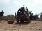 חרמון אילת מחולק לשני קטעים, "סטייג'ים" בשפת המרוצים. צפוני, מתל-פאחר עד למחלף עירון, ודרומי – ממחלף נשרים ועד אילת . כביש חוצה ישראל משמש כקטע קישור מנהלתי. מגיע לו, הוא הרג את דרכי העפר האחרונות במרכז הארץ. הסטייג' הצפוני מגוון, מפותל יפיפה. אבל הוא מפיל את התמימים בפח. הוא בסך הכול מתאבן למרוץ האמיתי. לא מעט צוותים נופלים בו ופורשים. אבל הרוב עוברים אותו בשלום ומוצאים את עצמם עד שעות הצהריים בשטח הזינוק למקצה השני, ליד קיבוץ גזר. נדב לוגסי, בכיר אופנועני הראלי-רייד והפייבוריט התמידי מאז שרז היימן עבר לנצח במכונית, מתוסכל – מכשיר הניווט הלוויני שלו שבק. נדב מחפש מברג שענים כדי לפרק את המכשיר הסורר, ולבסוף משתמש בלדרמן. עד כאן הוא ניווט על פי המפה בלבד, הזיכרון, והחוש. יונתן לוי, צעיר אלמוני על אופנוע סוזוקי, כבר מוביל את המרוץ. יונתן מי? הצוותים "הגדולים" מטפלים מייד במכוניות, מחליפים את הצמיגים ורפידות הבלם, מחזקים בולמי זעזועים. הצוותים העניים יותר (הרוב) מנסים לתקן מה שאפשר, שותים משהו (לא הרבה – שלפוחית לוחצת במרוץ ארוך לא עוזרת) שוטפים פנים, שוטפים את השמשה הקדמית. הם מחייכים, לכאורה עברו חצי מרוץ. ניר בן ארי, מהנהגים המנוסים במרוץ, בג'יפ סופה סטנדרטי, מחייך כתמיד. הג'יפ נוסע יופי, הוא אומר, אבל לא בולם. ניר איבד את הבלמים האחוריים במהלך הסטייג' הראשון, ונהג עד כאן בעזרת בלם החניה בלבד. בעצירת השירות הוא מבטל את הבלמים האחוריים, והוא ימשיך מכאן הלאה רק בעזרת הקדמיים- גם זה משהו. עידו כהן שהגיע ראשון לשטח השירות מרוצה מהרכב שהוא בנה, אבל פחות ממנוע הבנזין החדש. איטי מדי, המנוע חדש, עידו ספק מתנצל, הוא עוד ישפר אותו עד שיהיה מהיר מספיק. יש לעידו ואביב, הנווט שלו, חוויות מהסטייג' הראשון. פנצ'ר אחד שעיכב אותם, ותאונה קלה- סבסוב של 180 מעלות שנגמר בנזקים קלים. אביב מספר גם על טעות ניווט שעלתה להם ב10 דקות יקרות, ודווקא ליד הבית, בשבילים בהם הם נוהגים להתאמן. צוות הסיוע של עידו ואביב, בראשות ניר שרון הנוהג במשאית שנבנתה לסיוע במרוצי מדבר ארוכים, ויוחאי כהן, בסיירה המשמשת אותם כבר שנים רבות, מראים לכולם איך נראה שטח שירות אמיתי- תוך דקות נפרסת מתוך המשאית סדנא מצוידת לעילא, וארבע אנשי הצוות עטים על הרכב מכל כיווניו, מחליפים, מהדקים, ובודקים כל מה שצריך. לעידו ואביב זמן השירות הוא הזדמנות למנוחה קלה. גם צוות הסיוע של שי שמעוני, עם הסוואנה העמוסה לעייפה, פורס סככת שירות ומטפל ברכב ביעילות מרשימה. 30 דקות, לצוות מיומן, הן זמן ארוך מאוד. הצוותים האחרים, מצוידים פחות ומיומנים פחות, עושים מה שאפשר- לפאג'רו של גיל ספורט נוזל אחד מהבולמים. הדר זוהר- רכב הסיוע מטעם אספיר- מחליף להם את הבולם בבולם 9100 חדש, ליתר בטחון. הלל סגל ורז היימן נראית מודאגים, צינורות בלם שניזוקו במהלך הסטייג' הראשון עשויים לעכב אותם. למרות שאין מאחוריהם סדנה מצוידת בשטח, הלל מחליף צינורות, מוכן לזינוק. את הרוח האמיתית של זמן השירות אפשר לראות כאשר מתחרים אלמוניים מבקשים מהצוותים הגדולים סיוע- בלחץ אוויר, בורג 1/2 או כלי עבודה שאין בפאוץ'. הם כמובן נענים בחיוב- אין סיבה שלא. - אסף תמונות מהסרוויס בגזר (צילם: אסף קציר) |