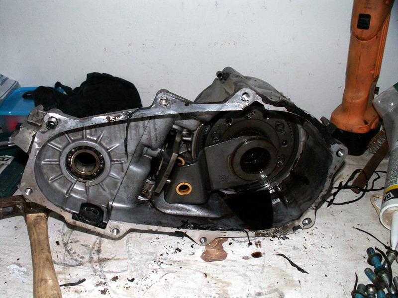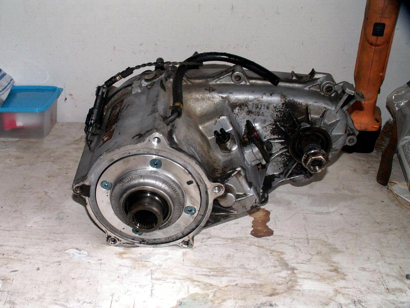 ... וכמובן תיבת העברה שמישהו חתם עבורה על כרטיס לתרומת איברים בעודה בחיים - בתמונה משמאל היא עדיין שלמה. פונה אלינו הצד הקדמי שלה, המתחבר לגיר הGM שלי. ניגש לעבודה...