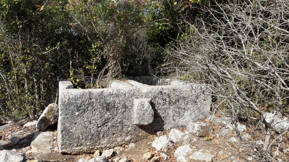 כבור מים, שרידי הטיח ניכרים. מאחורי הסרקופגים נמצאת גת גדולה.