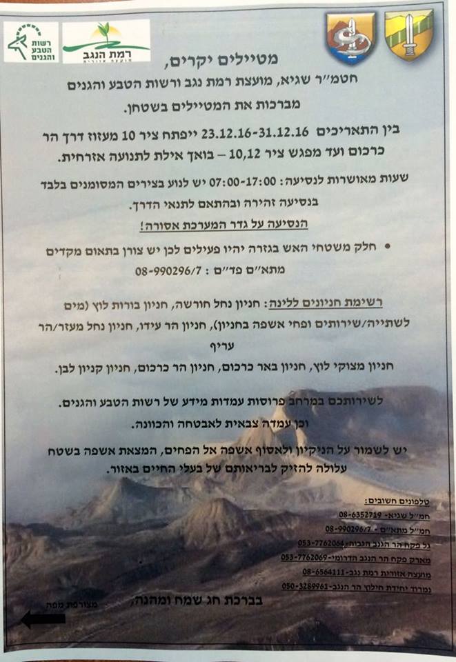 נקווה שלחץ ציבור המטיילים וריבוי פניות למתא"ם, למועצה האיזורית רמת הנגב ורט"ג יביאו להקדמת חלון הכניסה לשטח.