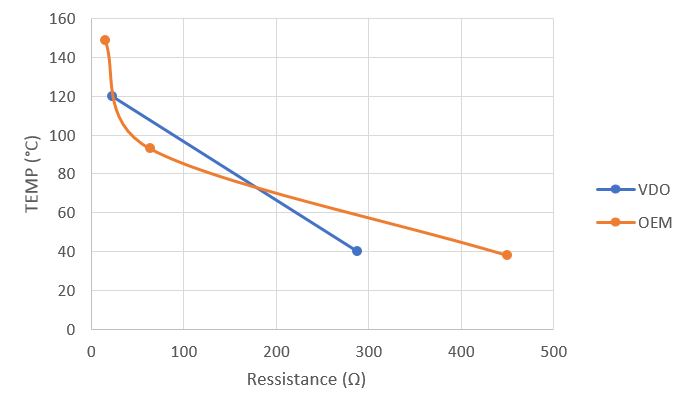 היחס בין טמפרטורה של הטרמיסטור להתנגדות הקטנה שלו לא ליניארי, אז קשה להגיד משהו על סמך 2 נקודות... למזלך בספר של הסופה נתנו נקודה שלישית. אבל בשביל הקטע המדעי, הנקודה של 120 מעלות של VDO דווקא כן נופלת בדיוק על הקו שאקסל מעביר בין שלוש הנקודות של השעון המקורי, ככה שיש מצב שהיחס כן סטנדרטי. כמובן שאם מישהו (חנן...) יודע להגיד שיש או אין תקן אחיד בתחום, זה יוכל לחזק את התשובה. אם זמן פנוי בידיך גיתאי, אתה יכול לקחת את החיישן ובעזרת מים חמים, מד טמפרטורה חיצוני ומולטימטר להוסיף עוד 2-3 נקודות לגרף וזה יביא אותך קרוב מספיק לתשובה.