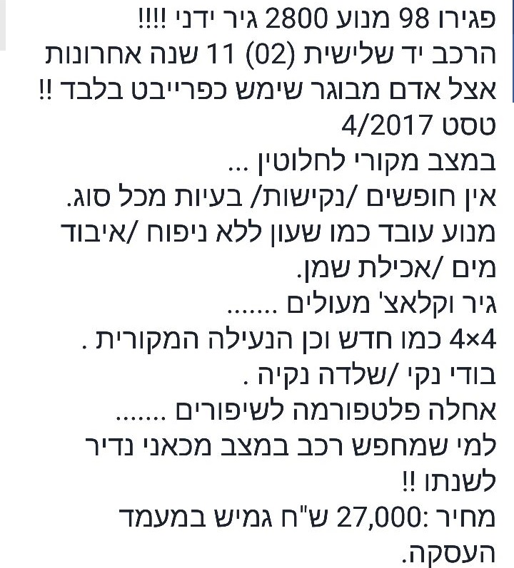 עם מודעה כזו הייתי בודק את הרכב מכל הכיוונים בכל דרך אפשרית. ככה לא כותב "אדם מבוגר", ואין רכב בן 18 בלי "בעיות מכל סוג", יש רק כזה שהבעיות שלו מוסתרות.