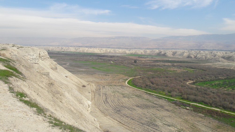 מבט לבקעת הירדן הירדנית .הירדן זורם בין השיחים וקרוב אלינו ,דרך הפטרולים.