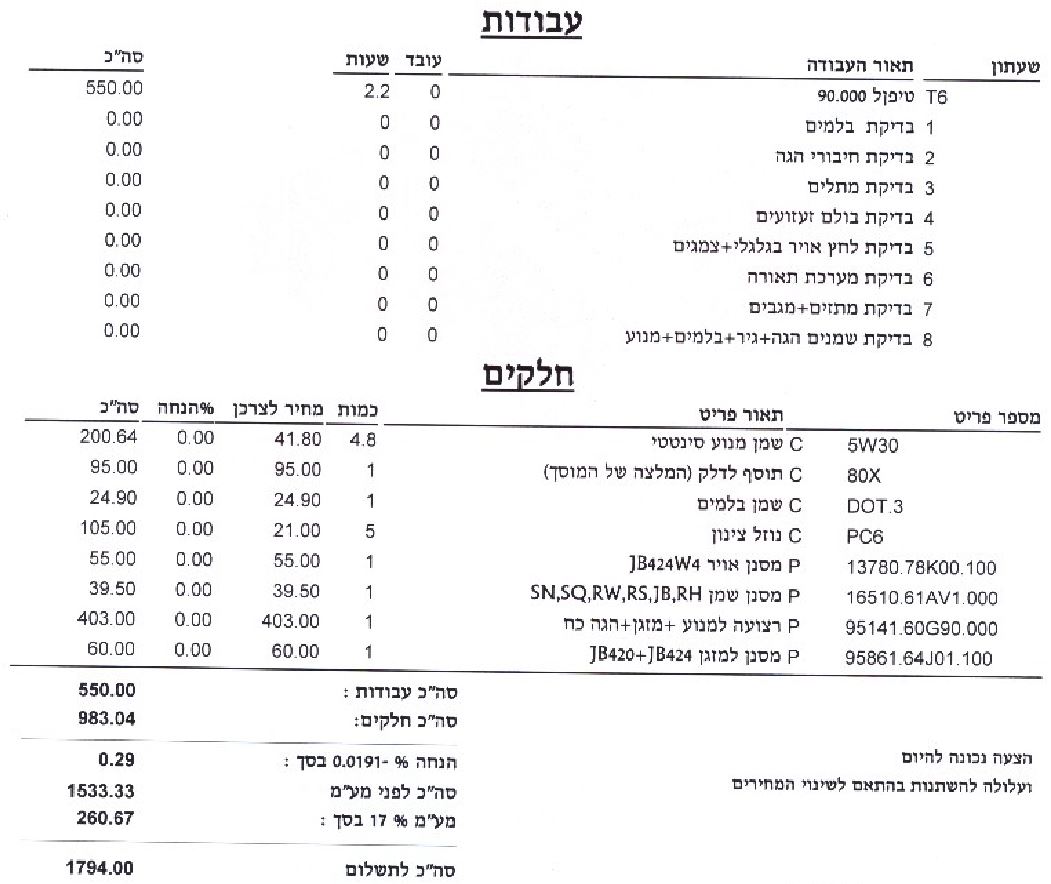אם המוסך נראה לך אמין וכאחד שתחזור אליו, הייתי מנסה לקבל שם הנחה מסוימת. נראה שמעט יקר. מדובר על מורשה סוזוקי או מוסך כללי?