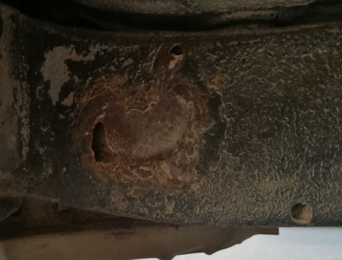 ישנה הלחמה של החיבור של קפיצי העלים לשלדה (מה השם של זה?) וכל העסק מזופת כך שקשה להבחין בכך במבט ראשון, מצרף תמונות טובות יותר, בחלק הזה נפער חור שדרכו אפשר להגיע לשלדה. בתוך החלל הזה בין השלדה לברזל שמולחם אליו הצטברו קצת חול ואבנים..