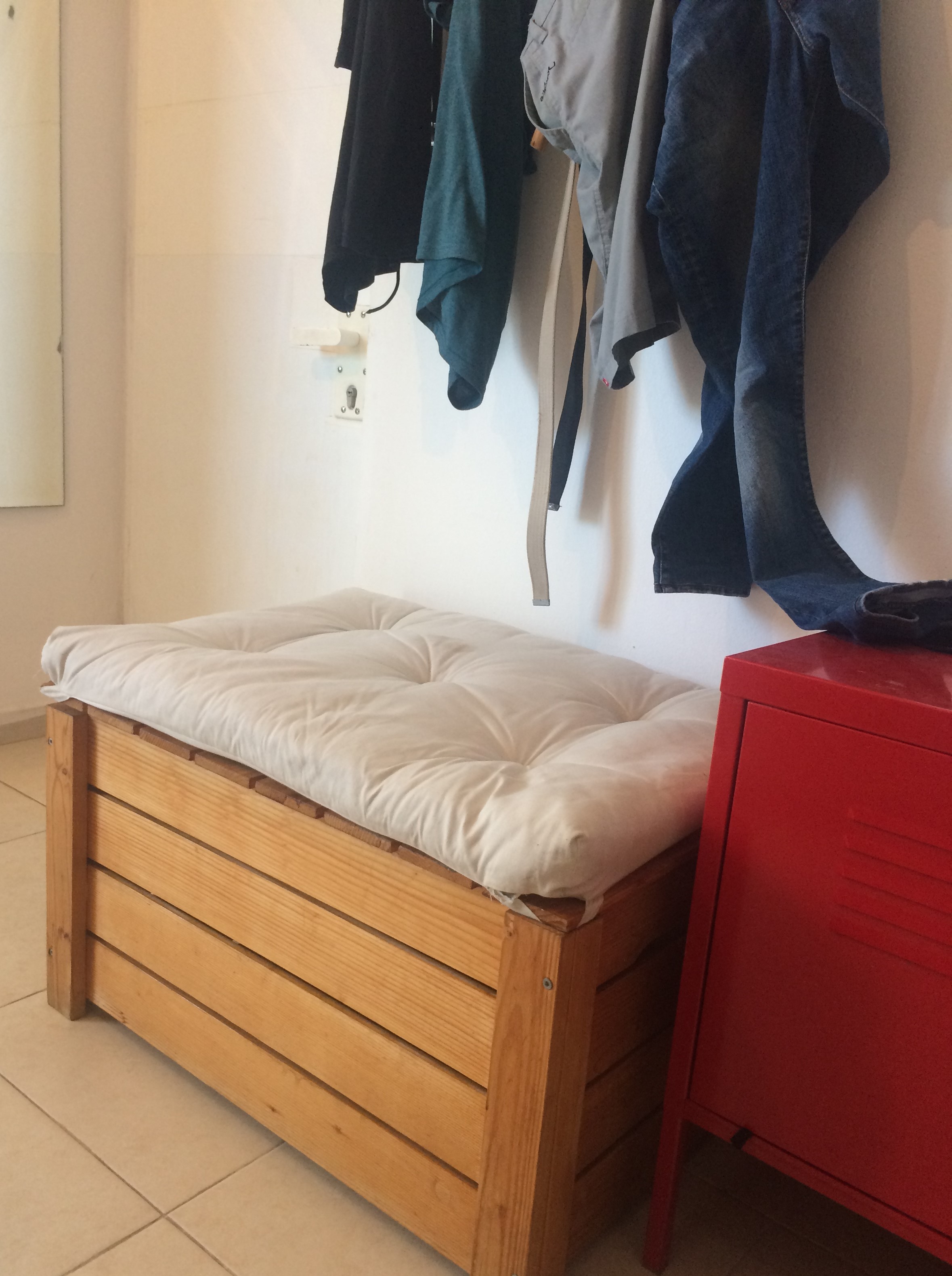 ארגז עץ מלא לאחסון עם פתח עליון וכרית ישיבה לבנה.