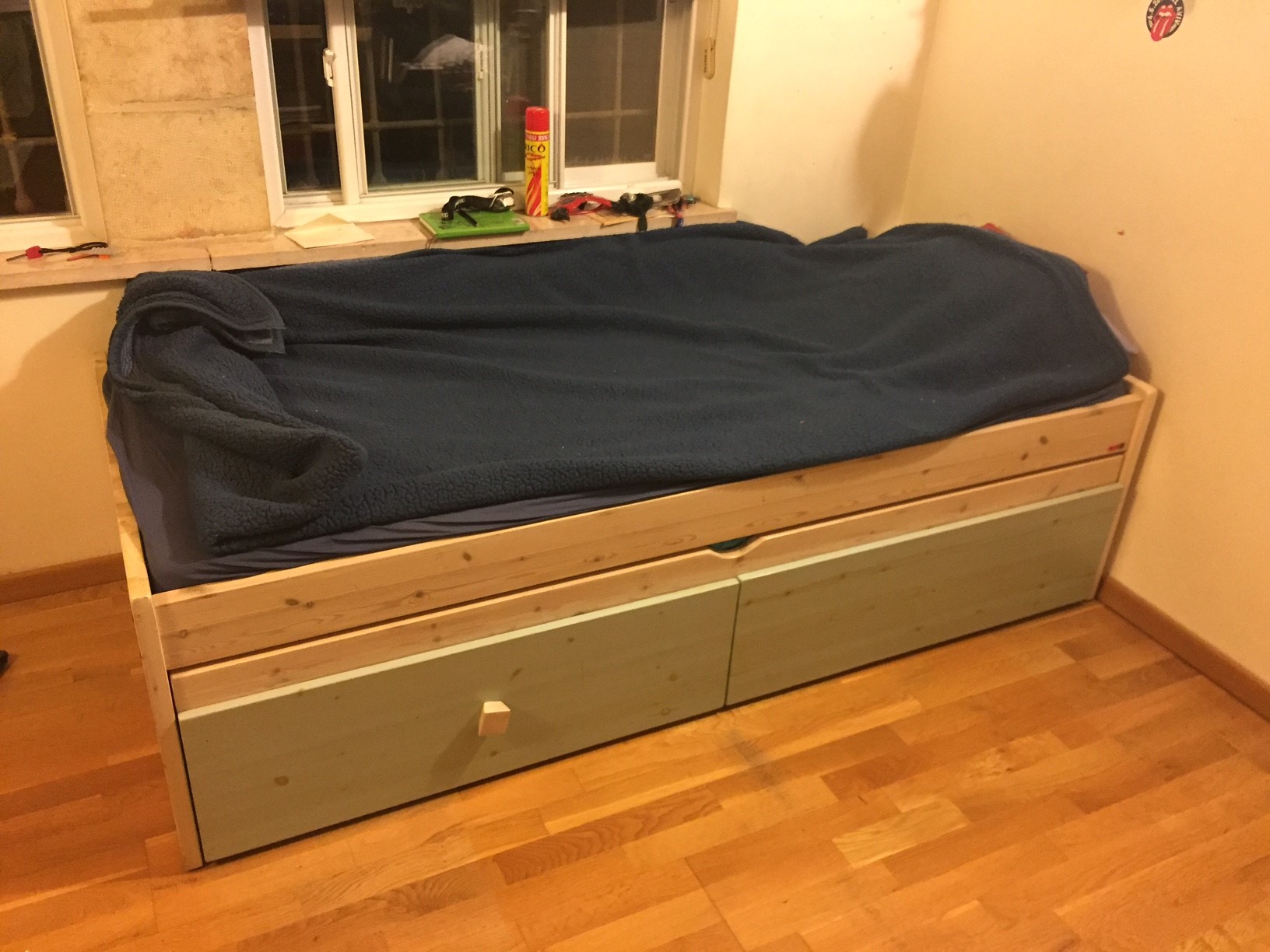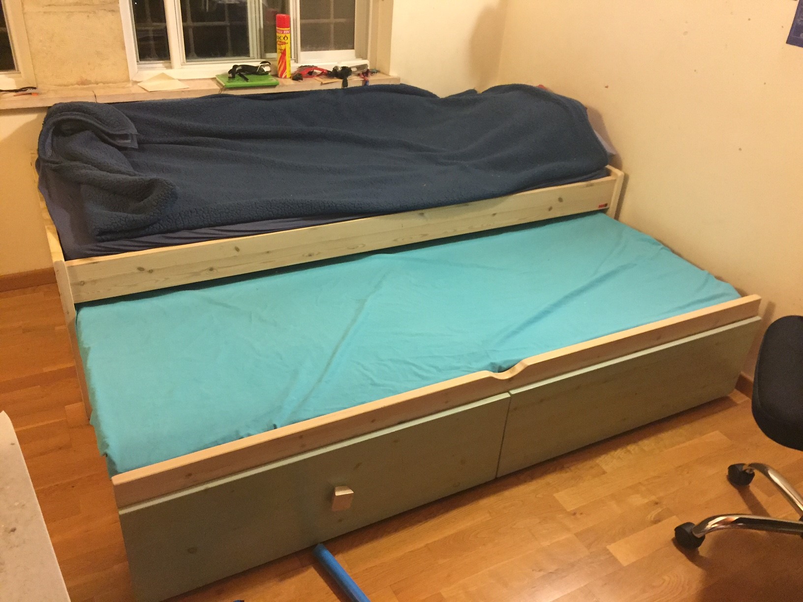 מיטת ילד מעץ מלא, עם מיטת אורח ושתי מגירות איחסון כולל 2 מזרונים, חסרה ידית אחת (כפי שניתן לראות בתמונה)