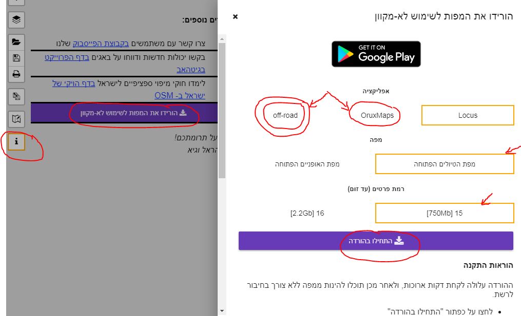 לאחר התקנת התוכנה, כנס לקישור של הורדת המפות מ IsraelHiking (כנס לאתר IsraelHiking מהמכשיר עצמו - https://israelhiking.osm.org.il, לחץ על צלמית ה- i (אודות / מקרא) ומשם לחץ על הכפתור "הורידו מפות לשימוש לא מקוון") בחר את תוכנת הניווט (אופרוד במקרה הזה), מפת הטיולים הפתוחה ורמת זום (15) ואז על כפתור ההורדה... ההורדה תתחיל ברקע ותימשך דקות ארוכות, בהתאם לאיכות התקשורת (רצוי לעבוד עם WIFI).