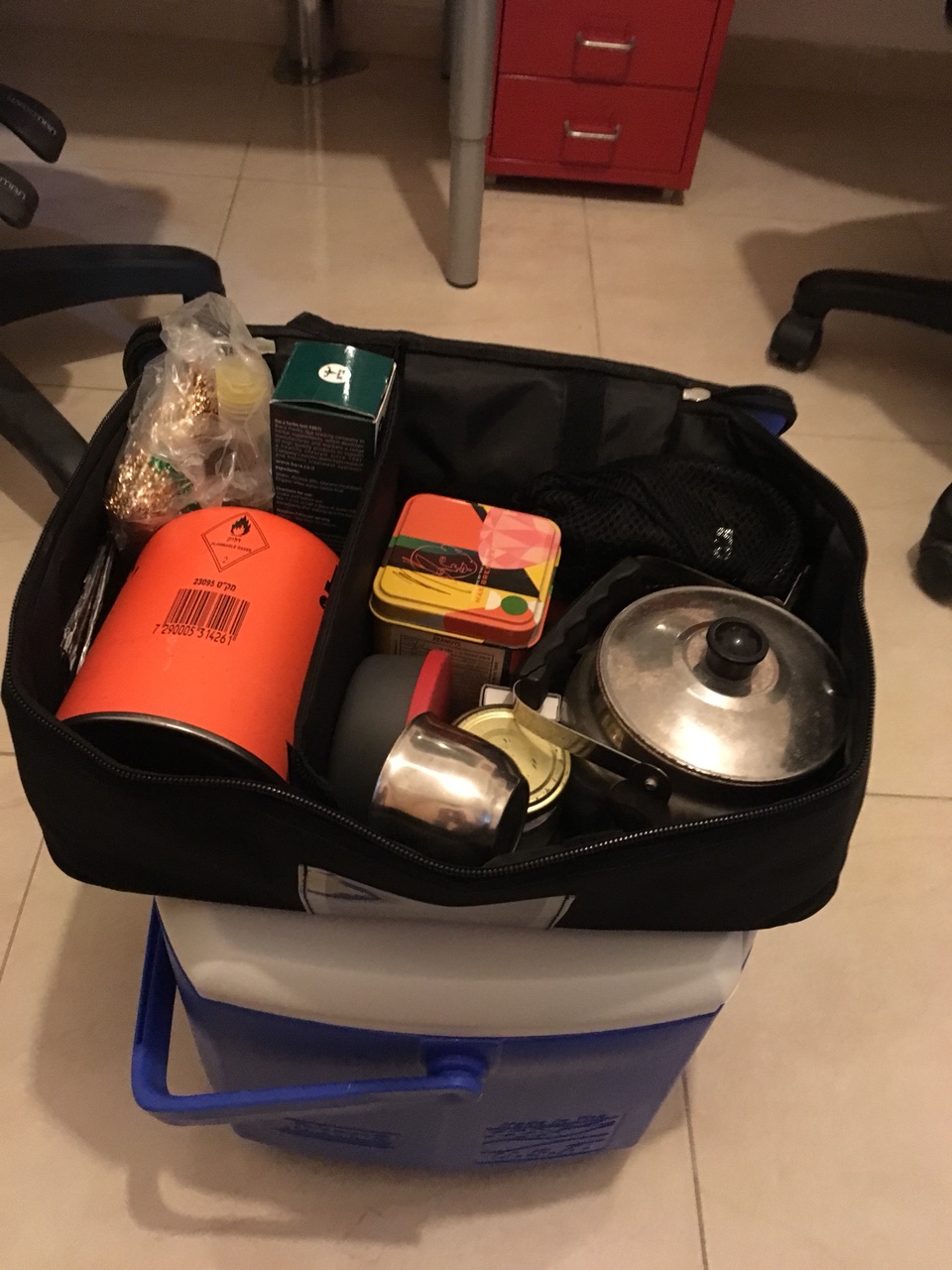 מכיל גזייה עם בלון הברגה גדול, תבלינים, כוסות, פינג׳אן, קפה תה סוכר, וסכו״ם וגליל שקיות זבל