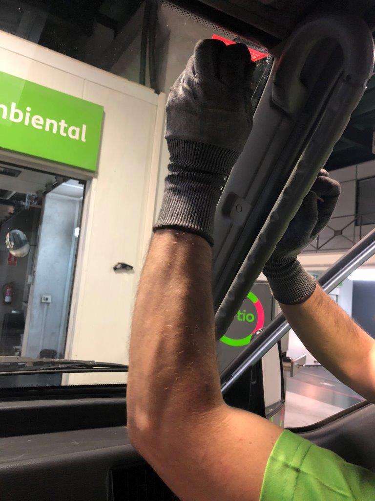 חזרנו לרכב מהקבלה, הדבר ראשון שהבוחן עושה זה מקלף את מדבקת הטסט הישנה. יש לו סכין טובה לזכוכית והמדבקה יורדת בקלות.