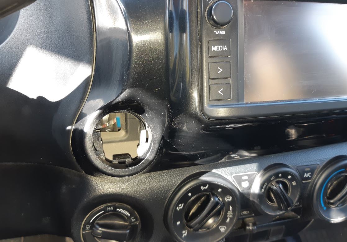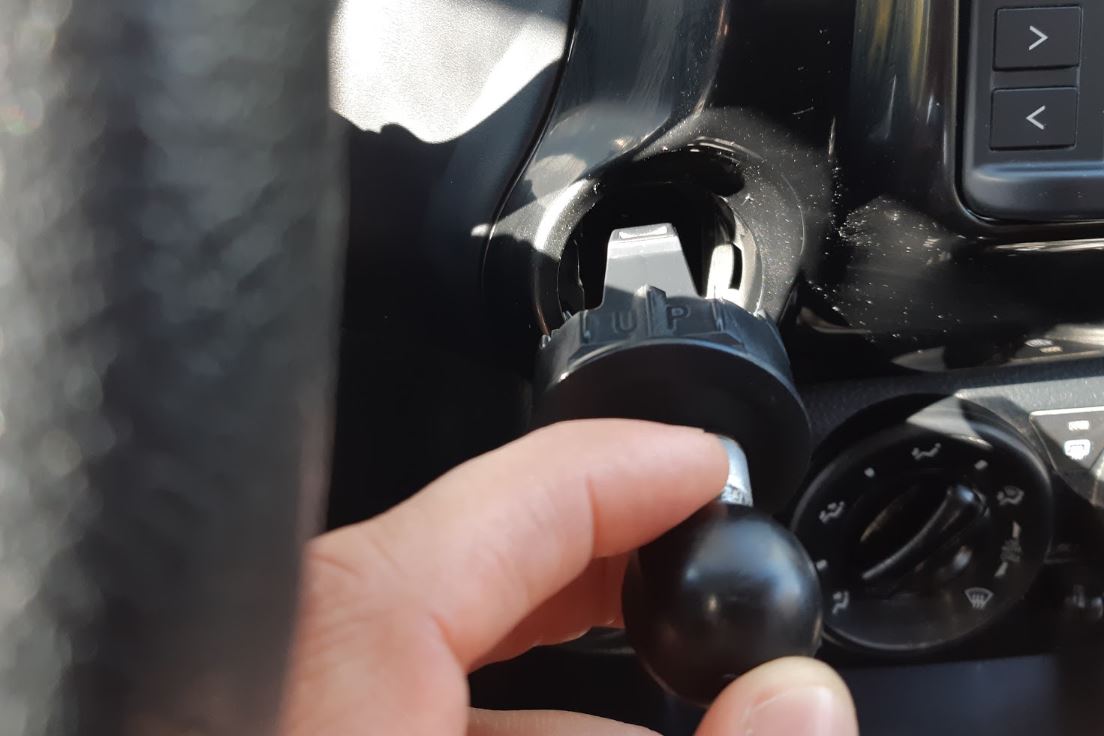ברכב החדש יש חור ריק במקום שבו בדגמים ברמת גימור גבוהה יותר יושב כפתור התנעה חשמלי. את החור סוגר מכסה פלסטיק. המיקום פשוט דרש שזרוע החזקת הטלפון תתחבר אליו. אוסף של זרועות וכדורי RAM התגלגל לידי כשאריות של פרויקט בעבודה. לקחתי את המכסה, מילאתי בין הצלעות שלו דבק אפוקסי (Scotchweld DP-100). נתתי לדבק יממה להמתמצק. קדחתי חור 6 מ"מ, וחיברתי כדור אינץ' אחד סטנדרטי של RAM עם בורג M6. בחרתי בזרוע הקצרה ביותר מהאוסף, והשלמתי עם מחזיק הטלפון האוניברסלי X-Grip של RAM אותו הזמנתי מאיש שטח.