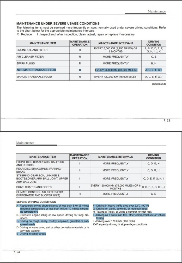 Kia calls for automatic trans fluid change at 60K miles under severe conditions. And "Severe Conditions" isn't as severe as you think. Common stop and go traffic and short trips are considered severe.