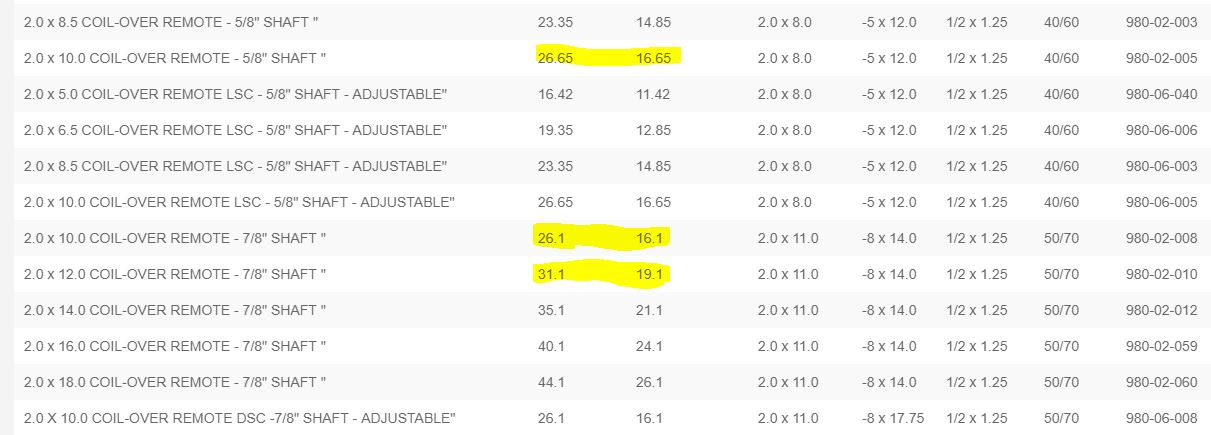לגבי אורך הקפיצים, המספר הראשון שרשום עליהם הוא אורך הסליל במצב רפוי, היינו המספר 800 הוא בעצם 8 אינטצ' . - במצב של פתיחה מלאה של הבולם צריך למדוד את האורך מתושבת העין במוט עד לסוף ההברגה בקצה העליון של הבולם, אורך זה ,בערך, צריך להיות סכום מערכת הקפיצים.