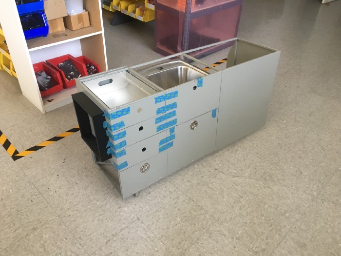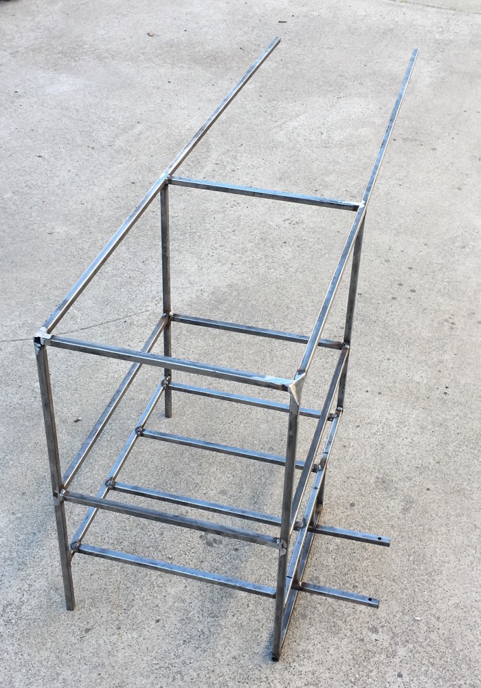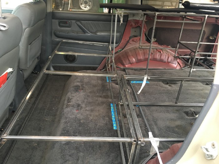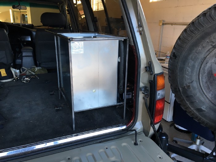 The cabinet frame is made of 1/2" square tubular steel frame. That would be covered in the future with aluminum sheets and powder coated gray to match the interior of the car. We sized the frame to fit the fridge.