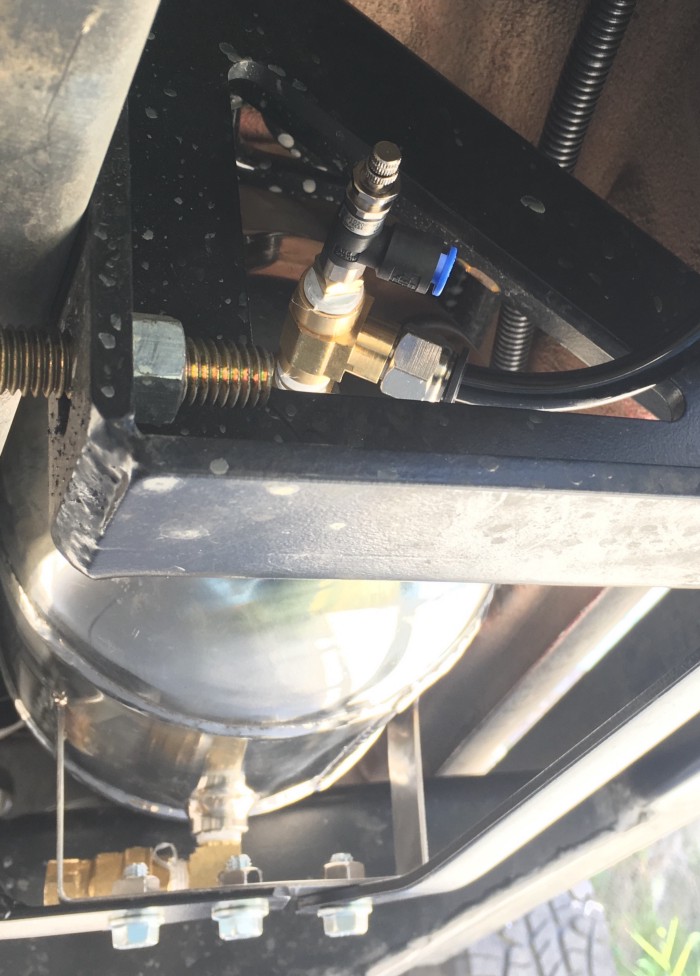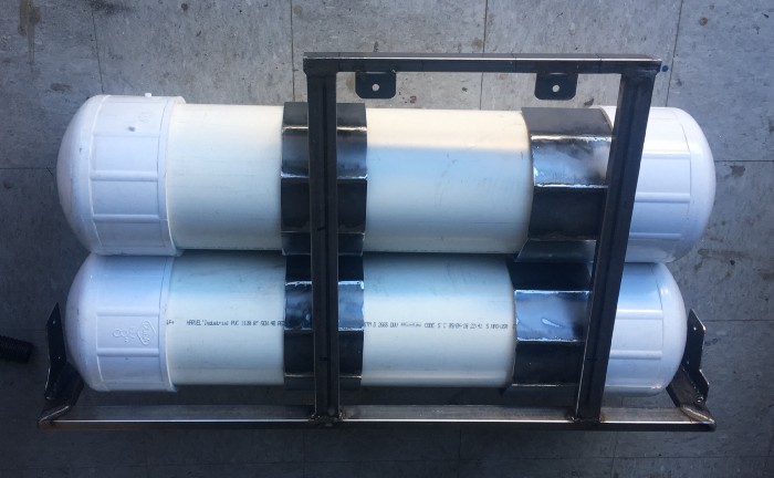 The water tanks were finally finished after a pressure test, and installed under the vehicle. We used 8" PVC pipes and they provided 9 gallons each. It heats 9 gallons to 150F in 18 minutes when the engine is running and warm.