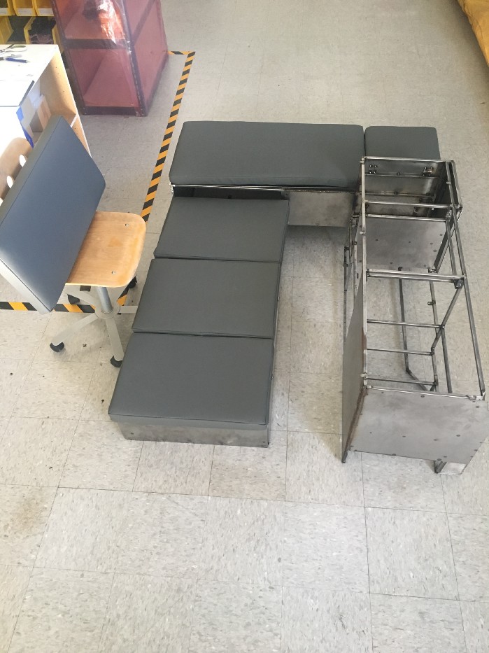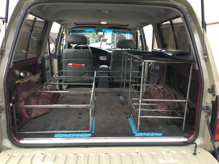 The storage compartment will be behind the front seats with 3 aluminum lids that hinge. We are not sure if we want this as compartments or one large storage that can be divided by boxes or storage bags. The two hatches on the driver side and center will have 2" cushions and will be the upper part of the bed.