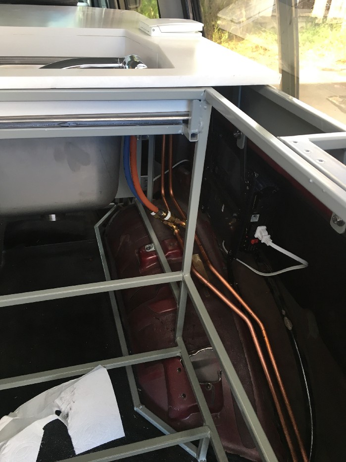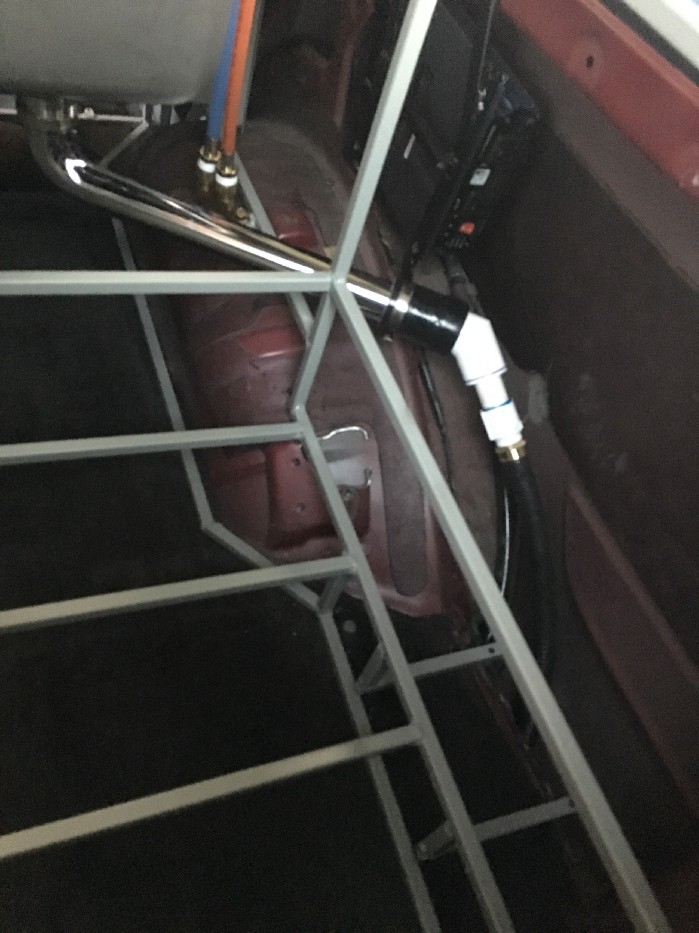 The drain for the sink was hooked up. The last section is silicon hose and it exits behind the right rear wheel. An extension can be attached if we want the water to flow away from the vehicle. Otherwise we can just put a small bucket.