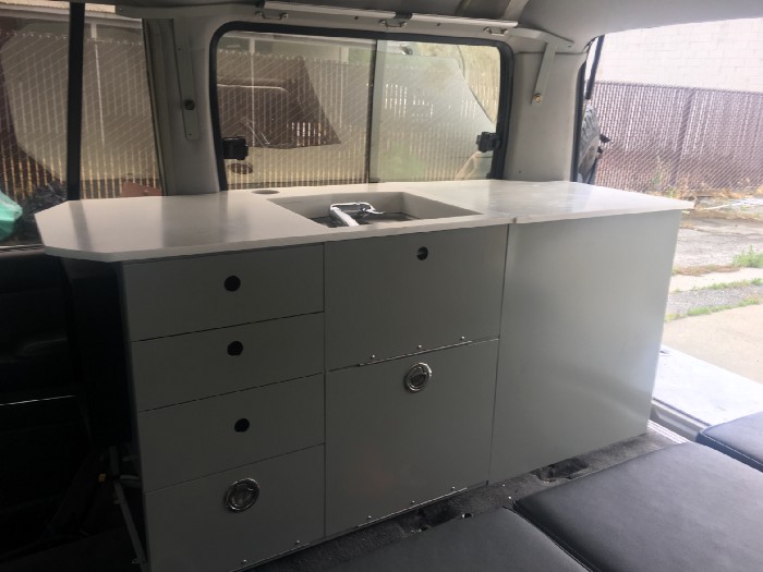Our next task is to find drawers and finish the storage unit behind the front seats. Last we will build the couch that turns into a bed.