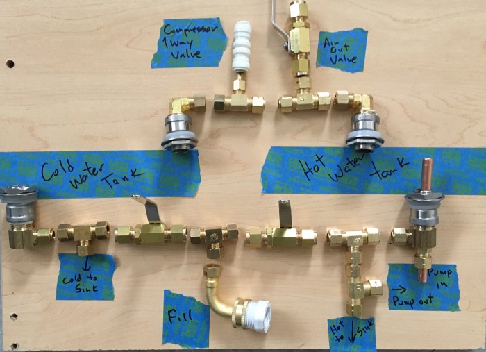 We did a test of the hot water system. Ran it through a 1 gallon container. It took 10 minutes to bring it to temperature. Seems like we will have hot water after all. The original pump that we chose was not self priming, so we chose a different pump. We used an old prius battery to run the pump.