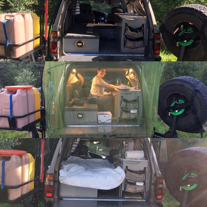 The process was, open the back, pull the stove on the tail gate and cook dinner. The Jerrycan in the back was handy to quick wash. We installed a faucet on the bottom of it, so it would be easy access. The kitchen was all set in the tail gate, except the pots under the sink.