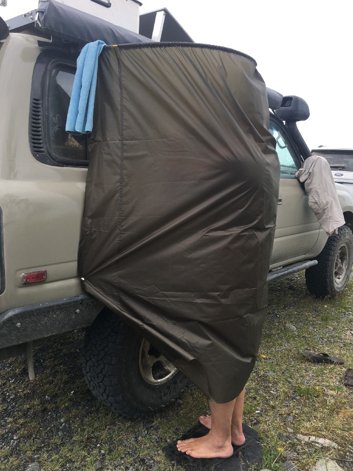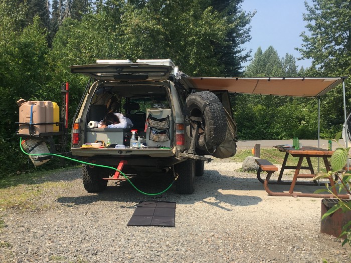 We stopped at a friend’s home in Seattle and our first camp was in Blue Lake, BC. Setup worked amazing. We cooked dinner and went to bed. No shower that night.