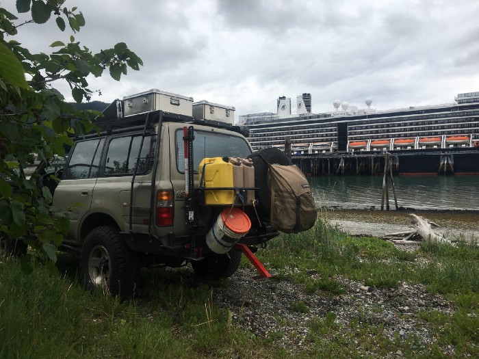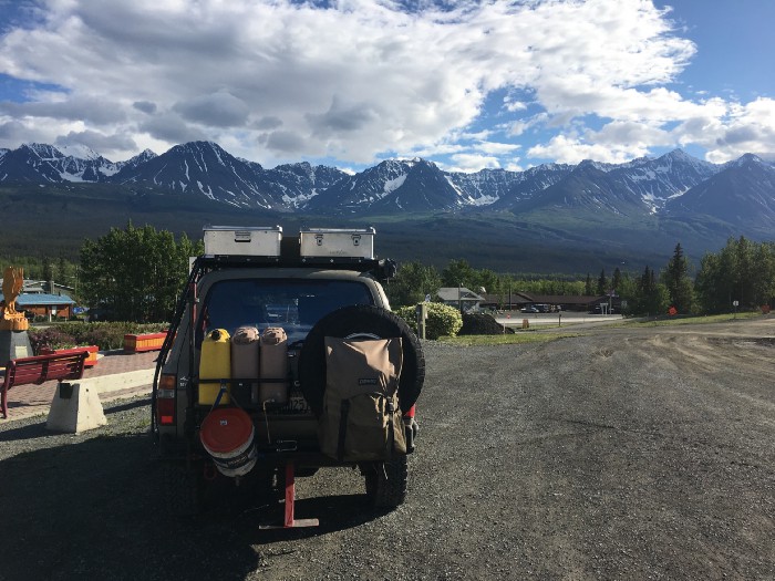 After 3000 miles we made it to the Alaska border. The bag tied to the spare tire ‘Trasharoo’ had a portable BBQ and the trash collected during the day.