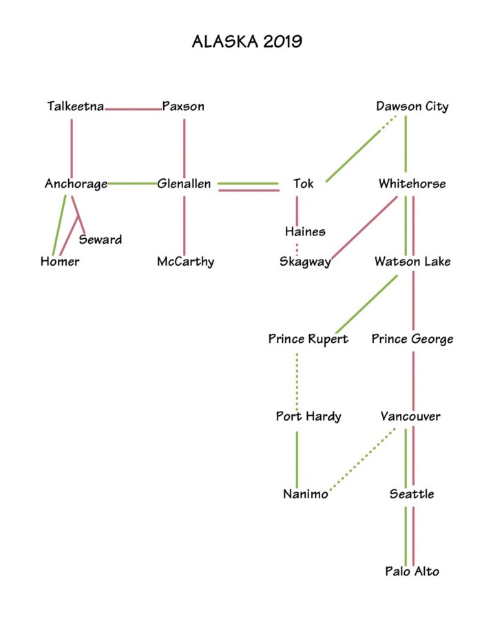 We planned the route so most roads would be traveled once starting and ending in Palo Alto, CA. Dashed lines are done in a ferry, green is the return route.