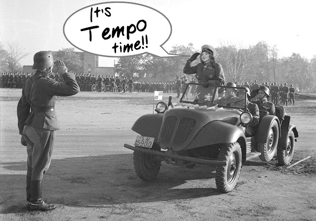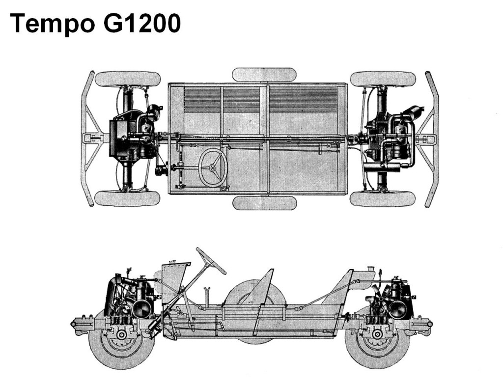 אכן. קודם כל הרכב - יצרן גרמני שנעלם בשם Tempo-Vidal, יצר רכב 4X4 קל משקל לשימוש כללי - ג'יפ - אחד מהראשונים בעולם. איך? כמובן, שני מנועים, כל אחד מניע סרן. כמו שדרור ציין, זה מתלה swing axle... אבל לא סתם. זה גם swing motor - המנוע הקדמי מתנדנד יחד עם הסרן!