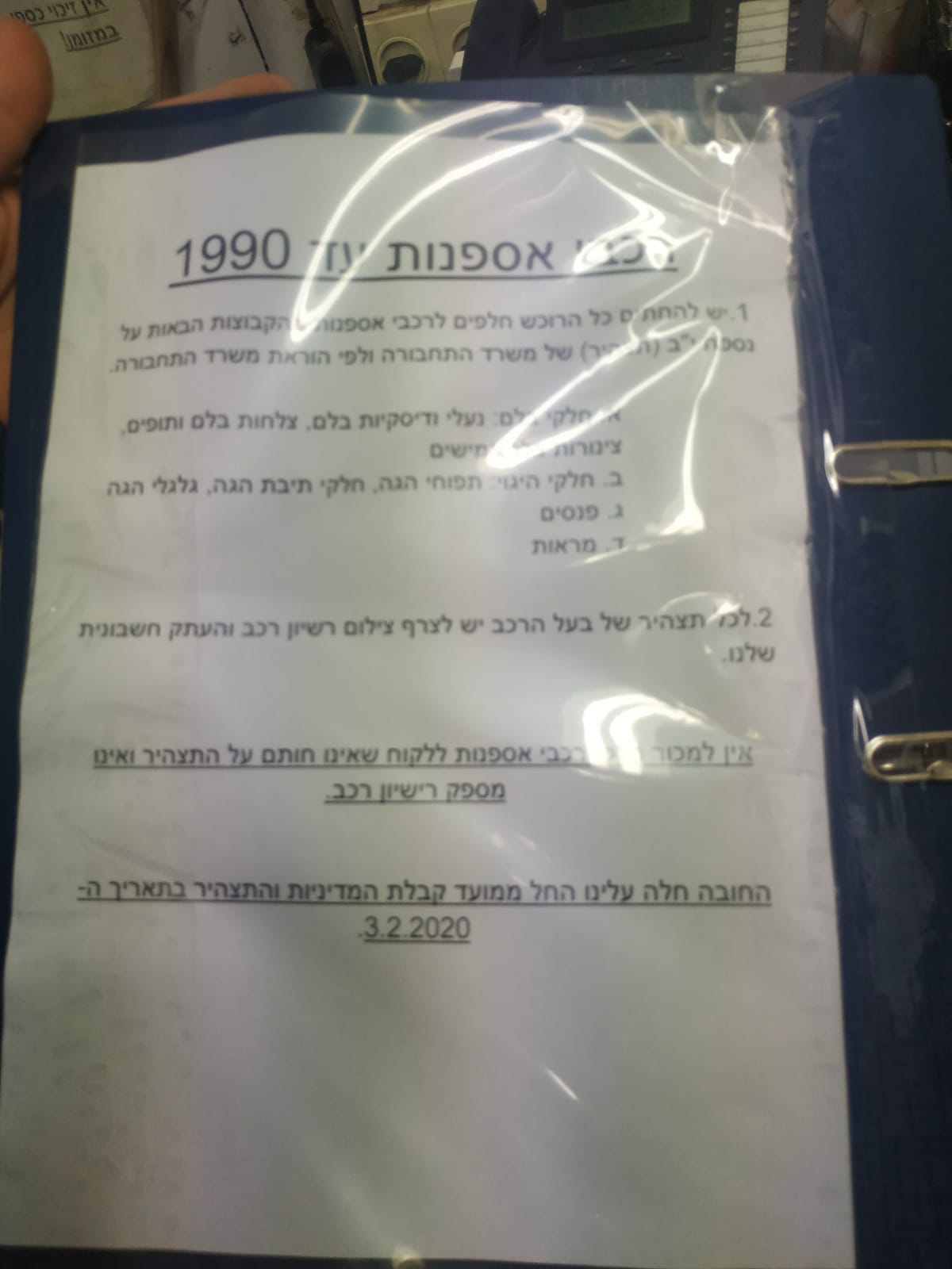 מסתבר שגורם כלשהו מטעם משרד התחבורה החליט שעל מנת שהם יוכלו למקור חלקי רכב בטיחותיים לרכבי אספנות (הגה, ברקס, אורות, מראות) על הלקוח למלא נספח יב' לנוהל יבוא, לצלם רישיון רכב, ולכל זה מצרפים העתק חשבונית... אם לא תבצע את כל אלו לא מוכרים לך. ממה שהבנתי מהחבר'ה בינוביץ' כביכול קניתי עכשיו חלקים "ביבוא אישי" והם פשוט גורם מתווך כלשהו.. כרגע זה מעין פיילוט לחצי שנה והוא חל על חנויות חלקי חילוף בודדות.