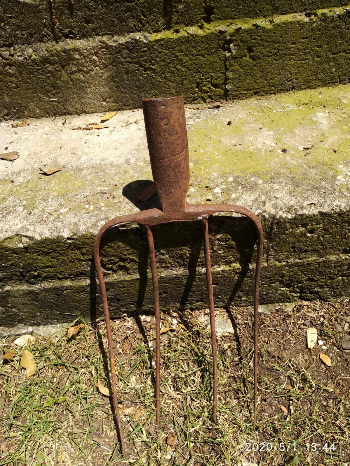 טוב, המכוש, הטוריה והמעדר עברו הסרת חלודה רופפת עם מברשת פלדה המחוברת למברגה ולאחר מכן ממיר חלודה.