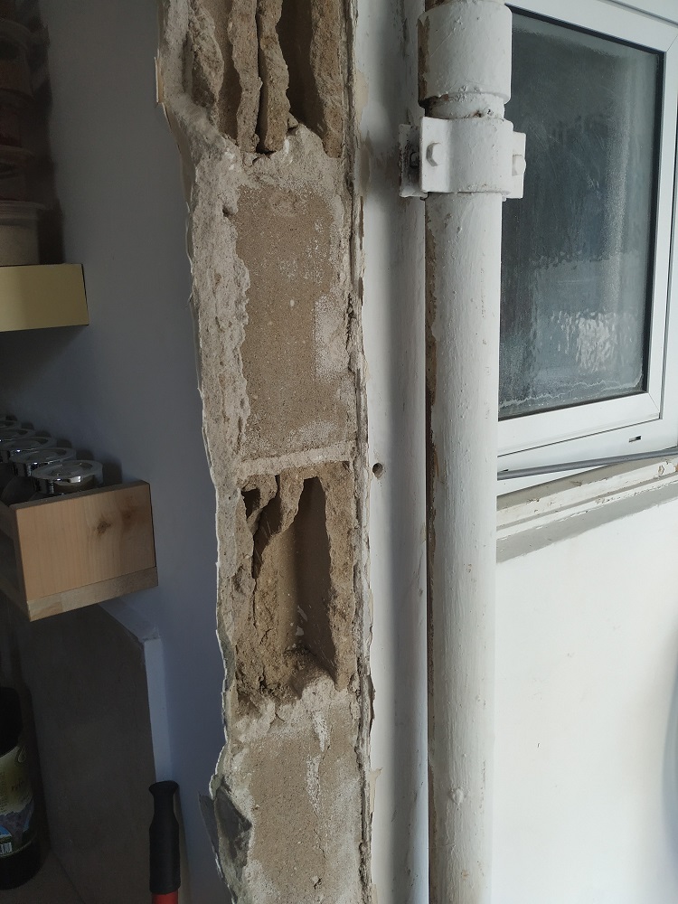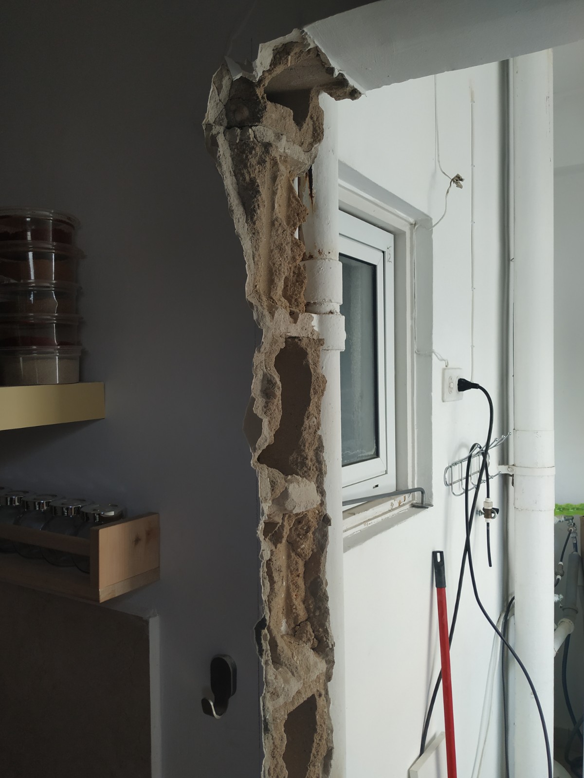 החלטתי לוותר על הגבס וללכת על טיח, לשם כך התחלתי ואמשיך לשבור את הקיר עד הקו עם הקיר הניצב כדי לצמצם את עבודת הטיח למינימום.