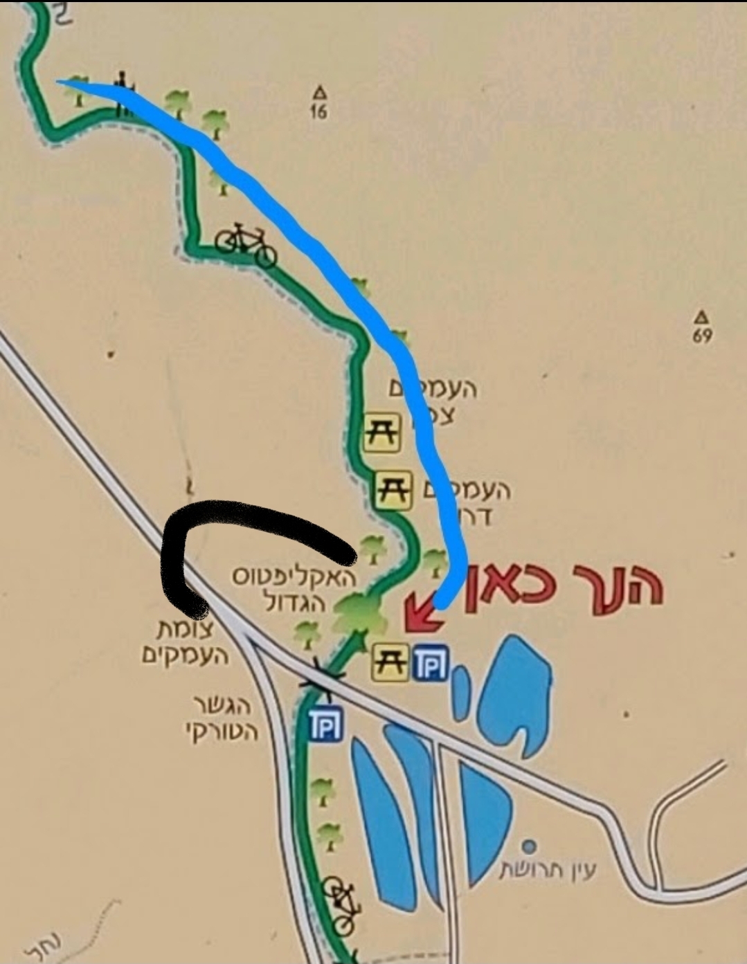 מפת האזור-הכניסה מכיוון קריית טבעון,יש שלט "נחל קישון"-השביל עובר מתחת להמשך כביש 6 - מנהרות כפר חסידים"