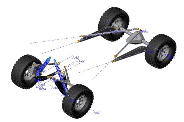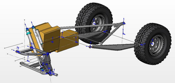 דוגמא מארכיון תכנון הTT שלי - באחת זרוע A שבאמת מתחברת לסרן בתפוח אחד (כמו אצלך ברכב) ובשני זה זוג מיסבי קצה שיש בינהם מרחק מסויים. המרחק הזה מאפשר לכוון את מיקום ציר הגלגול.