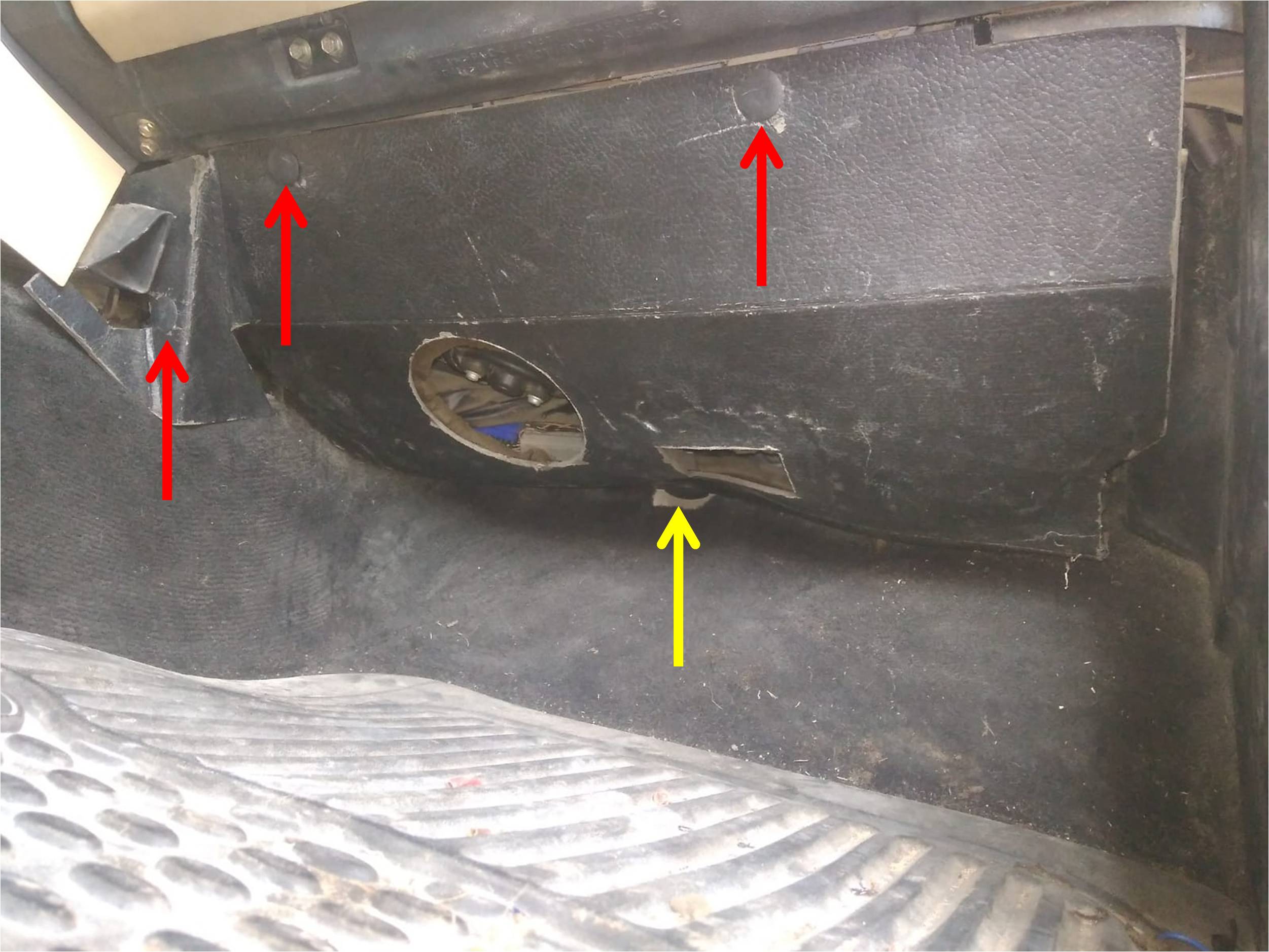 מוחזק ע"י שלושה פיני משיכה מפלסטיק, ועוד תפס פלסטיק שיוצא בהברגה. מוציאים בעדינות עם מברג רחב, או כלי ייעודי את שלושת הפינים, ומבריגים החוצה את הרביעי. מוציאים את החיפוי, סבירות גבוהה שכל הספוג שדבוק אליו יתפורר. ניתן להדביק פלציב במקומו, וניתן פשוט להשאיר ככה.