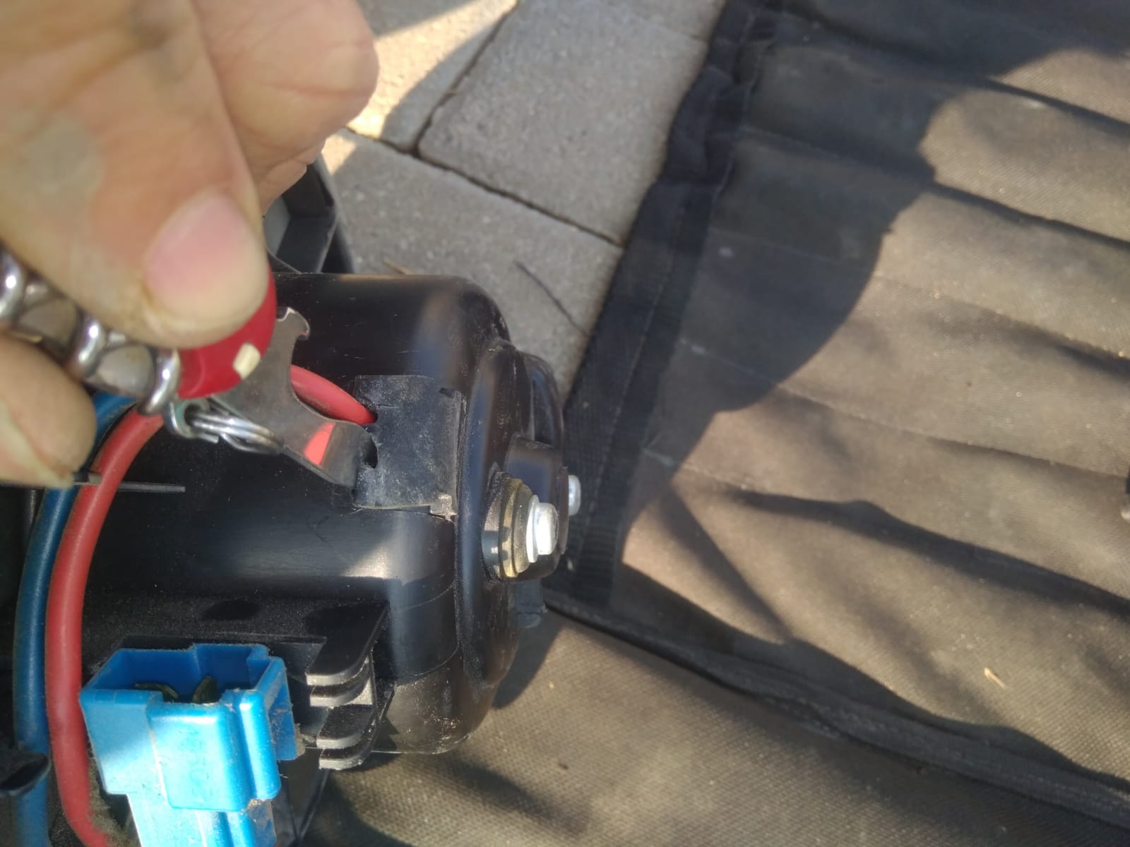 הבחור המפוייח מההודעה הקודמת, הוא כניסת המתח לבלאוור. החוטים לא נראו מפוייחים, והמפוח מסתובב בחופשיות, אז החלטתי פשוט להחליף מחבר. מכיוון שלא היה לי תחת היד מחבר זהה, התשמשתי במחברים שיש לי לזרמים יחסית גבוהים של מכשירי קשר (החוטים עבים יותר מהחוטים המקוריים).
