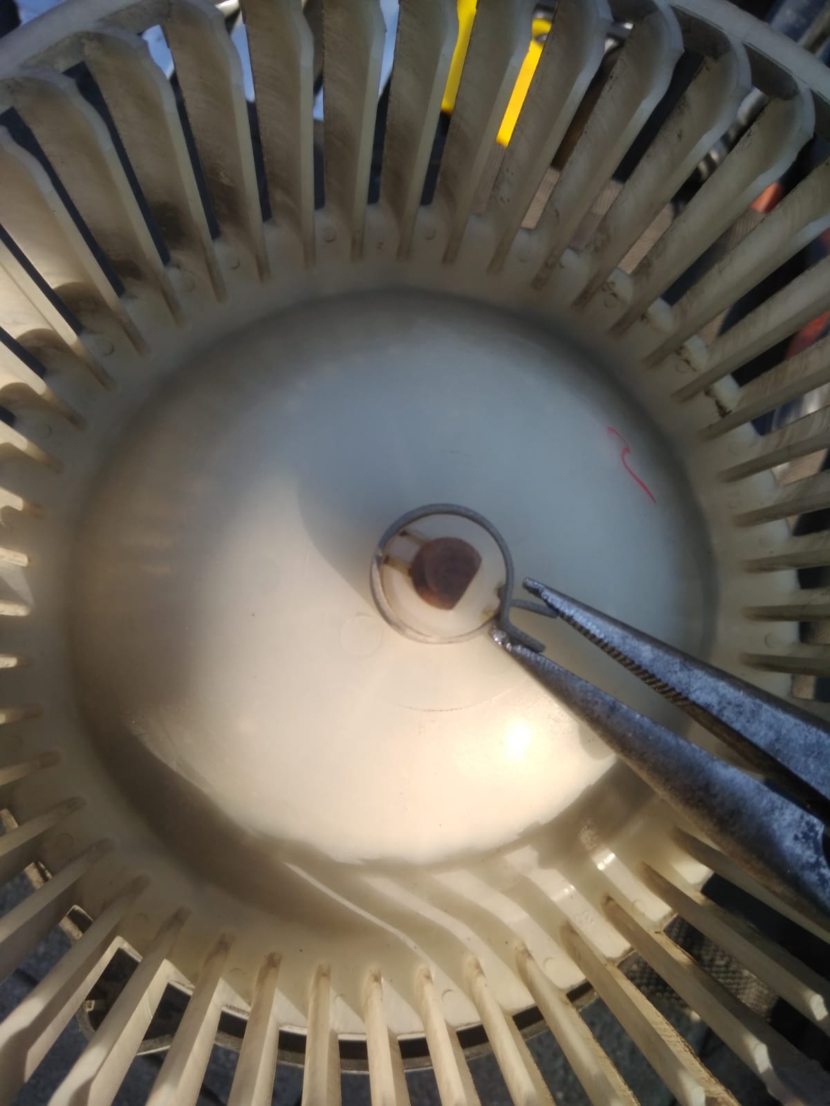 בשלב הבא, נפריד בין המניפה למנוע. המניפה מוחזקת עם טבעת קפיצית שאותה נרחיב עם פלאייר (אני עשיתי עם קשפיץ, אבל כל פלאייר יספיק).